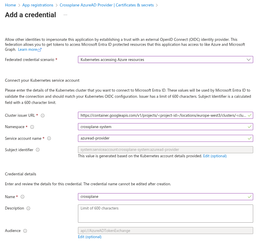 Workload Identity Federation is rapidly becoming the modern standard for authenticating workloads. In this post, I will configure the Crossplane AzureAD provider to use a Kubernetes-issued service account token to authenticate to Azure, eliminating the need for long-lived secrets.